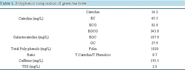 研究人員要求這批女性日均飲用三杯綠茶,共飲用四個月的綠茶。從表1中,我們可以看到所砌綠茶中的多酚成分:表兒茶素(EC)、表兒茶素沒食子酸酯(ECG)、表沒食子兒茶素沒食子酸酯(EGCG)、表沒食子兒茶素(EGC)、沒食子兒茶素(GC)。